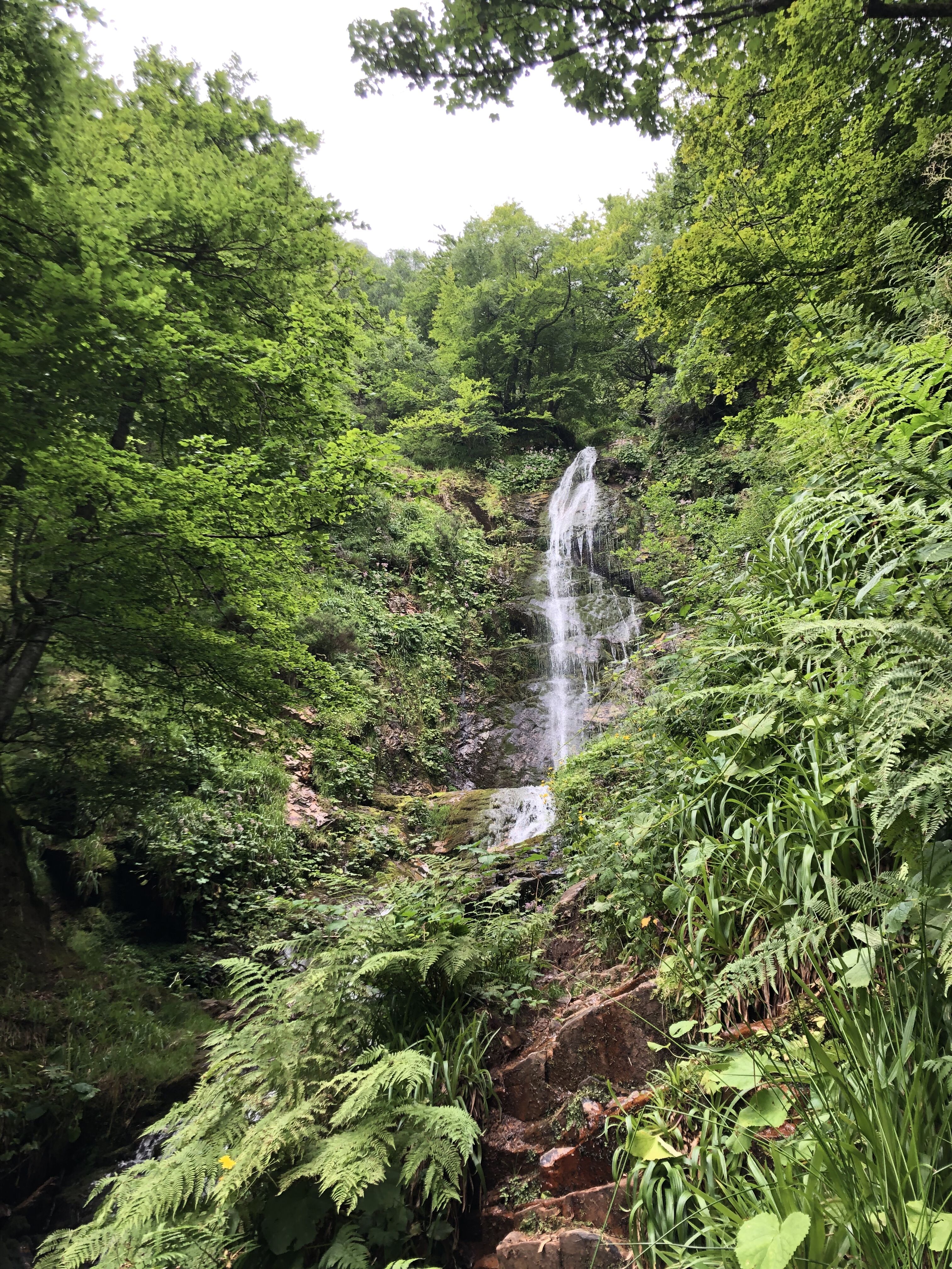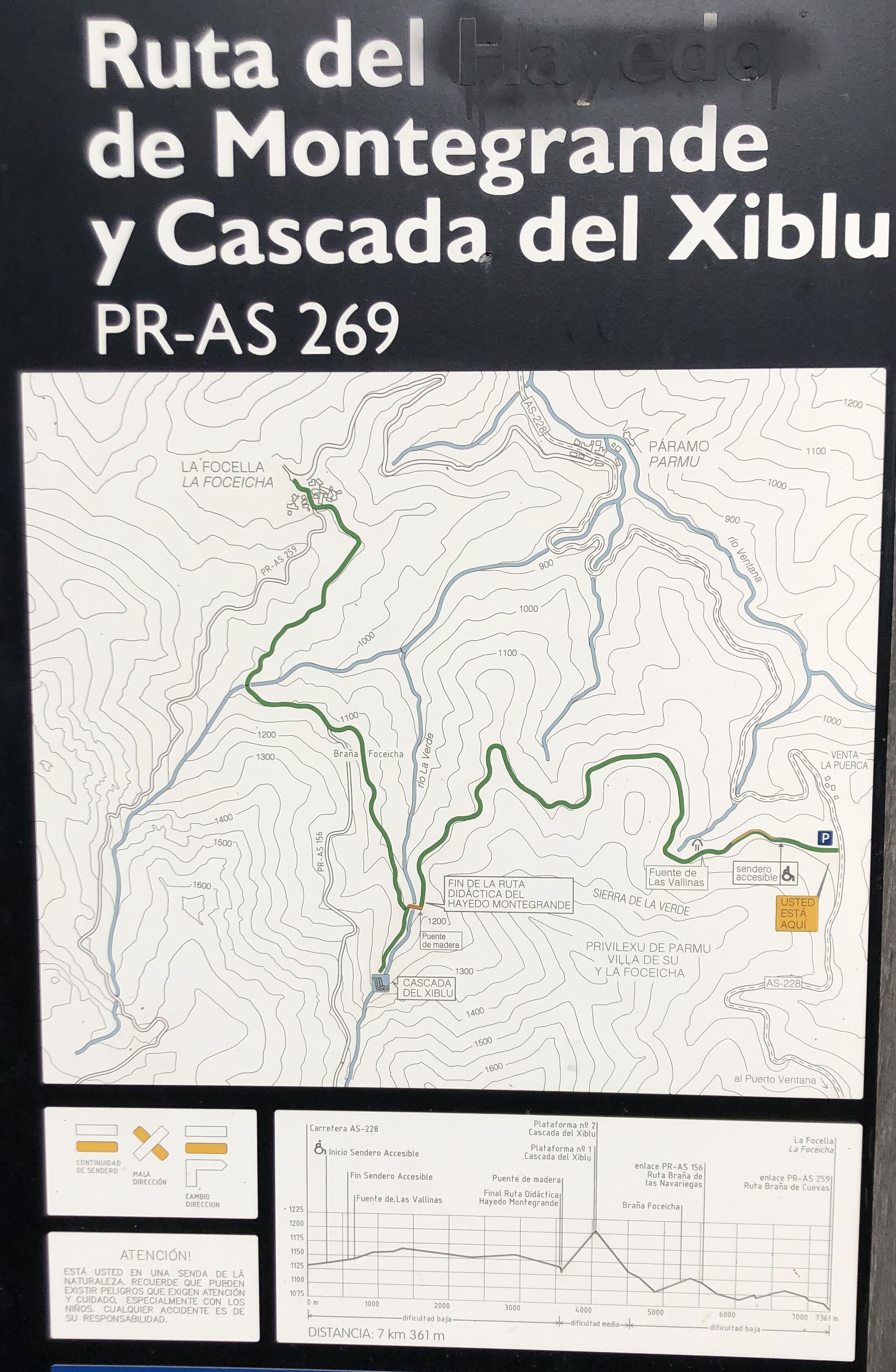 La ruta empieza desde un pequeño parking de tierra 3-4 kilómetros pasado el pueblo de Páramo. Allí nos encontraremos los carteles de mapa e inicio de ruta. Desde allí parte un sendero amplio y bien señalizado. La ruta transcurre sin apenas desnivel por el Hayedo de Montegrande durante aproximadamente 3.5 Km hasta llegar al río La Verde. Una vez allí, atravesamos el río por un bonito puente de madera y comenzamos una ascensión de aproximadamente 1 Km. Nos encontramos una señal que indica la cascada hacia arriba, el pueblo de Focella hacia la derecha y el hayedo por el que veníamos. Tomamos la ruta de la izquierda para ascender a la cascada. Se trata de una buena subida, dificultada por la humedad del terreno, sin embargo dispone de escalones y cuerdas que facilitan mucho el ascenso. Una vez arriba encontramos la impresionante cascada, que aun en pleno agosto bajaba con fuera (Habrá que volver en Primavera para verla en todo su esplendor).